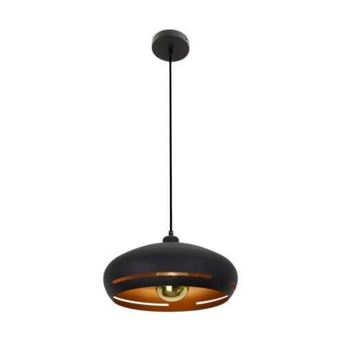 Deze prachtige Chericoni Striscia hanglamp zwart met een gouden binnenzijde. De hanglamp is een van onze vele eigen ontwerpen: een strakke, stoere designlamp. Door de vorm en look van deze lamp, is deze in vele interieurs een echte eyecatcher. Door de speelse openingen in de lamp creëer je een spannend lichtspel op de muren. Door het ontwerp van de lamp past hij in veel interieurstijlen, denk aan hotel chique en industrieel. De Striscia-serie biedt verschillende opties in verschillende maten, waaronder hanglampen in cream, zand en zwart en plafondlampen in creme, zwart en zand. Zo kun je eenvoudig een samenhangend lichtplan creëren dat past bij jouw interieur. Let op: Deze hanglamp wordt geleverd zonder lichtbron. Geschikt voor een E27 fitting, zodat je zelf een lichtbron kunt kiezen die bij jouw stijl en sfeer past.Formaat