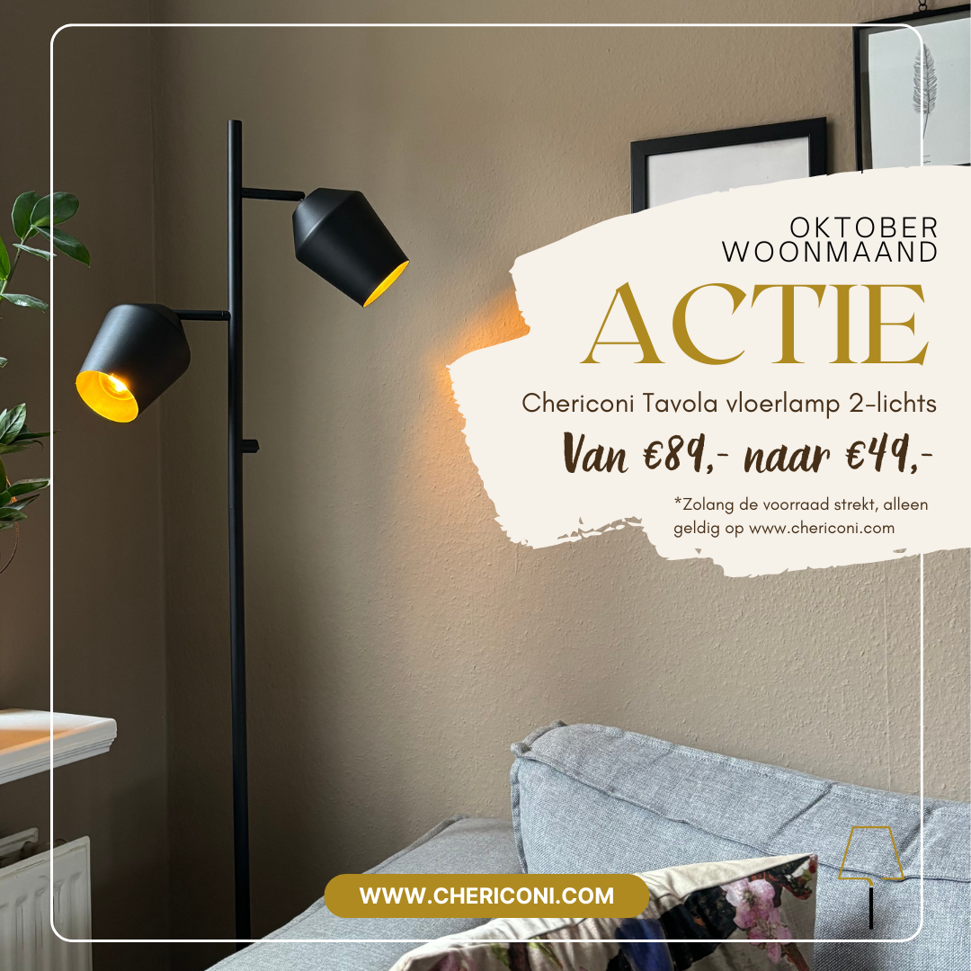 De Chericoni Tavola Vloerlamp met 2 lichtpunten is een moderne blikvanger die functionaliteit en stijl moeiteloos combineert. Het strakke, open ontwerp van zwart metaal geeft de lamp een tijdloze uitstraling, terwijl de dubbele lichtbronnen zorgen voor een sfeervolle verlichting in elke ruimte. Perfect te combineren met decoratieve filamentlampen voor een extra warme en moderne touch. Deze vloerlamp is ideaal voor gebruik naast een bank, in een leeshoek of als opvallend element in een minimalistisch interieur. Maak je interieur compleet met de andere lampen uit de Tavola-serie, zoals plafondspots in zwart en goud (1, 2 en 3 lichts), de hanglampen Ø25 cm en ø50 cm, elegante tafellampen (Ø15 cm en Ø25 cm), en vloerlampen met 1 of zelfs 5 lichtpunten. Creëer een samenhangend en modern geheel met de veelzijdige Tavola-serie! Let op: Deze hanglamp wordt geleverd zonder lichtbron. Geschikt voor een E27 fitting, zodat je zelf een lichtbron kunt kiezen die bij jouw stijl en sfeer past.Formaat