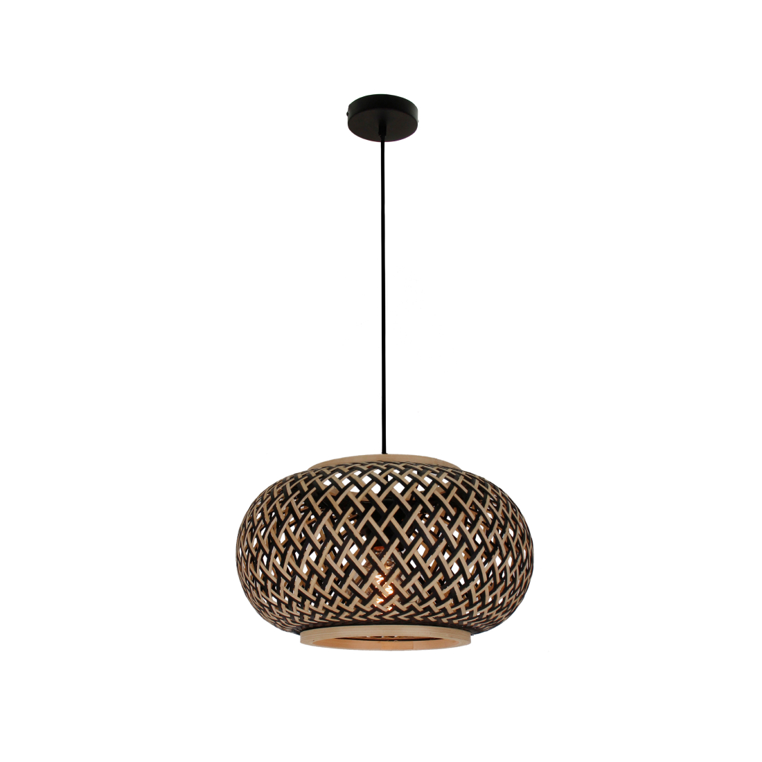 Breng warmte en een vleugje natuur in huis met de Weaving hanglamp. Deze unieke lamp is vervaardigd uit bamboe en uitgevoerd in een combinatie van natuurlijke en zwarte tinten. De geweven kap zorgt voor een speels lichteffect en geeft elke ruimte een uitnodigende uitstraling. Met een royale diameter van 44 cm is deze hanglamp een echte eyecatcher boven de eettafel, in de hal of als sfeerverlichting in de woonkamer. Het natuurlijke materiaal en het stijlvolle ontwerp maken deze lamp perfect voor bohemian, Scandinavische of moderne interieurs. Let op: Wordt geleverd zonder lichtbron. Geschikt voor een E27-fitting, zodat je zelf de gewenste sfeer kunt bepalen.